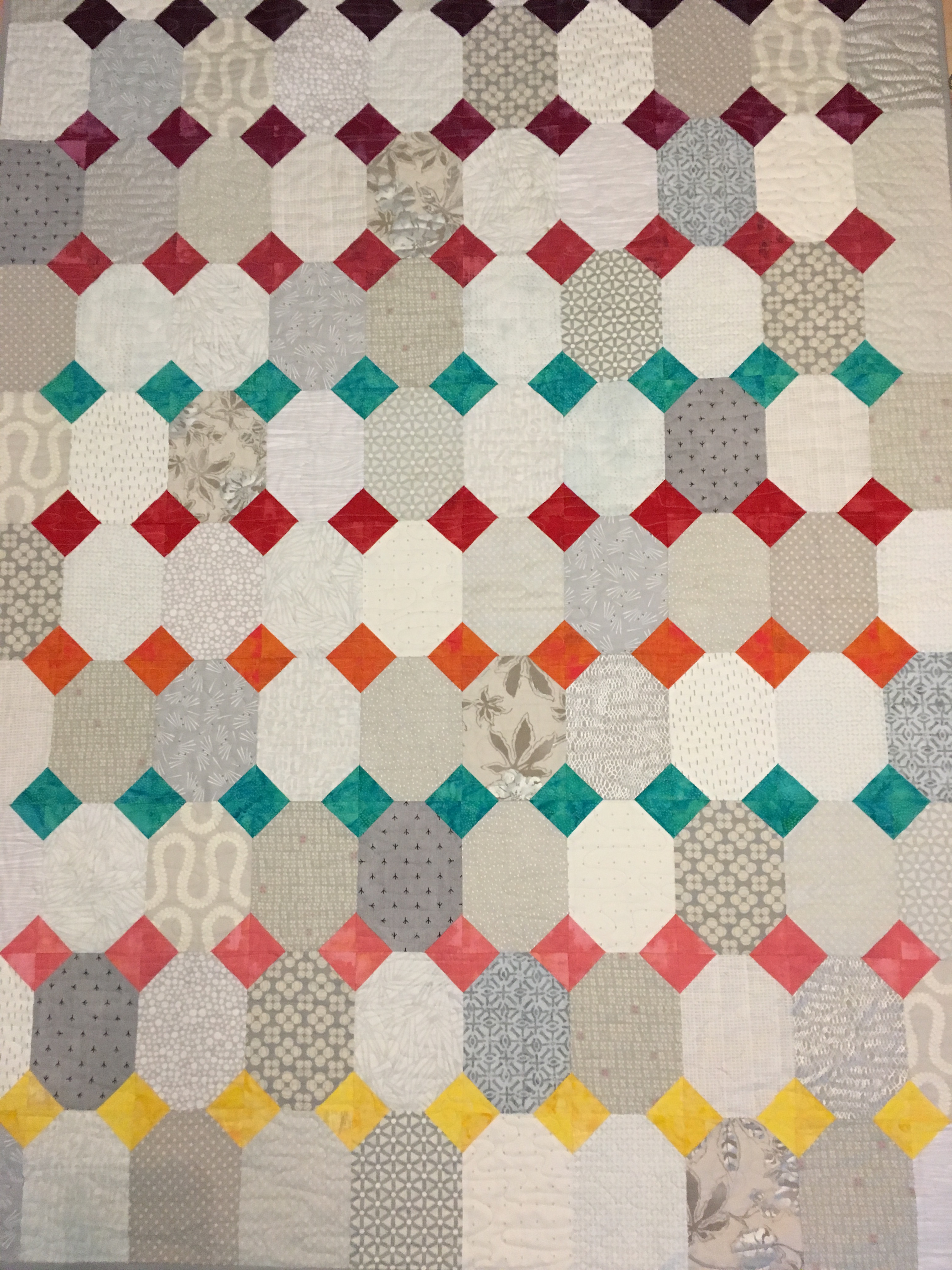 I worked for a day basting the quilt first, then loaded it onto the HQ Simply 16 machine and went to town, using one of my favorite quilting patterns: water.  It’s a nice all-over design that pulls everything together, including, to my pleasure, the various greys, taupes, ivories and creams, which I sometimes wondered if I had made the right decision in putting them together the way I did.